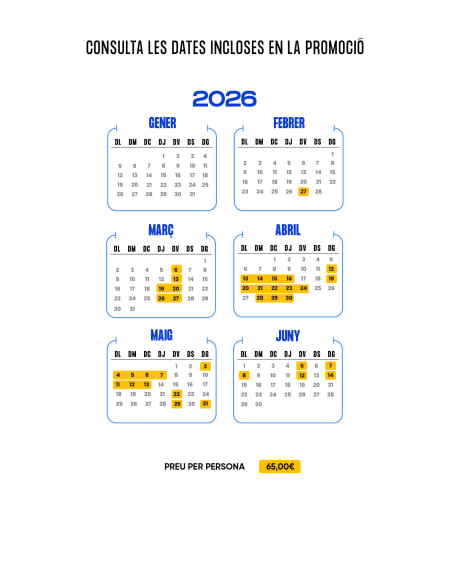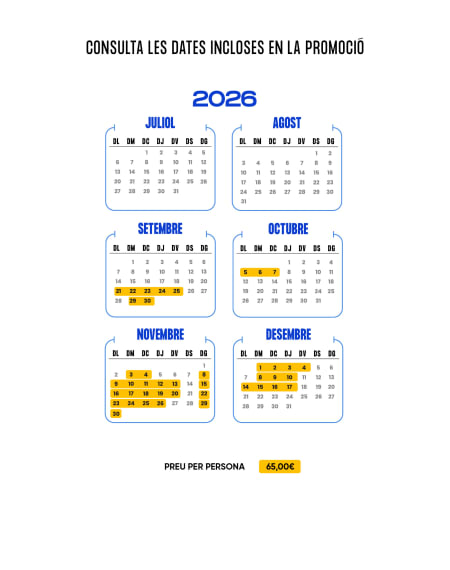 - Desembre: 01; 02; 03; 04; 08; 09; 10; 14; 15; 16; 17 - El preu de 65 € està limitat a un màxim de 30 habitacions per data de validesa per a reserves realitzades fins al 31/12/2026.
