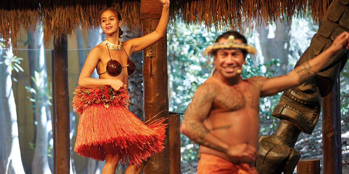 Entdecken Sie zu den Rhythmen unserer Tänzer, wie Sie ein polynesisches Pareotuch tragen, während Sie exotische Speisen probieren.