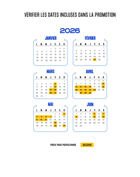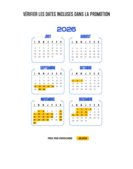 - Décembre : 01 ; 02 ; 03 ; 04 ; 08 ; 09 ; 10 ; 14 ; 15 ; 16 ; 17 - Le tarif de 65 € est limité à un maximum de 30 chambres par date valide pour les réservations effectuées jusqu’au 31/12/2026.
