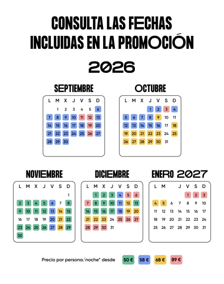 Consulta el calendario para comprobar la disponibilidad de la promoción y escoger cuando visitarnos hasta el 5 de enero de 2027.